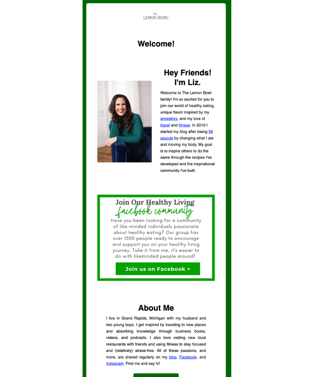 The welcome series is your chance to make a great first impression on new subscribers who join your email list. You can start by setting the stage — let new subscribers know who you are and the story behind your food blog. What inspires you to cook? Then, give them a taste of what to expect. Briefly describe the types of recipes you share and even include links to your “best hits” or most trending recipes you’ve created. Below is an example from The Lemon Bowl of how Liz greets every new subscriber with a personal story of what caused her to get in the recipe creation space in the first place.