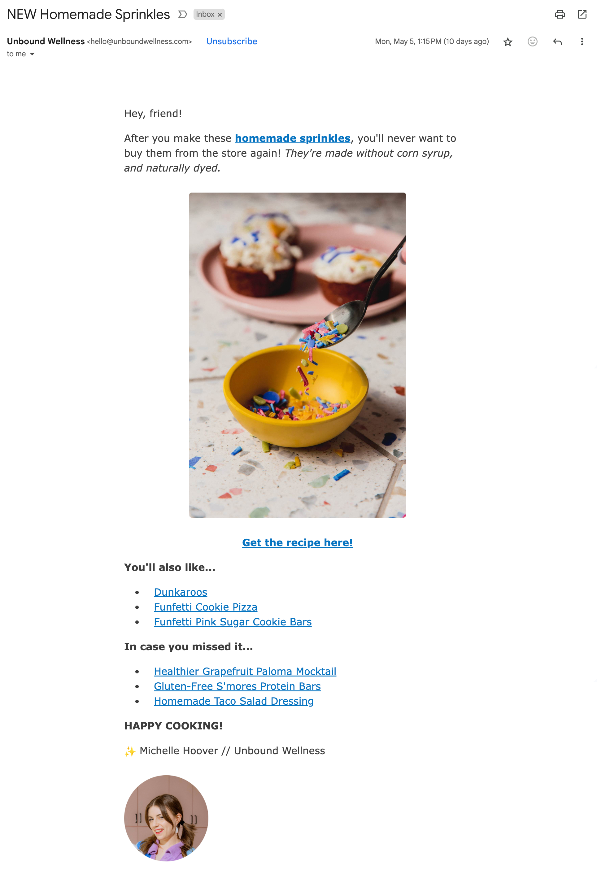 Michelle Hoover, aka Unbound Wellness, nails this with her homemade sprinkles email. She keeps it short and sweet and focused on her latest sprinkle recipe.