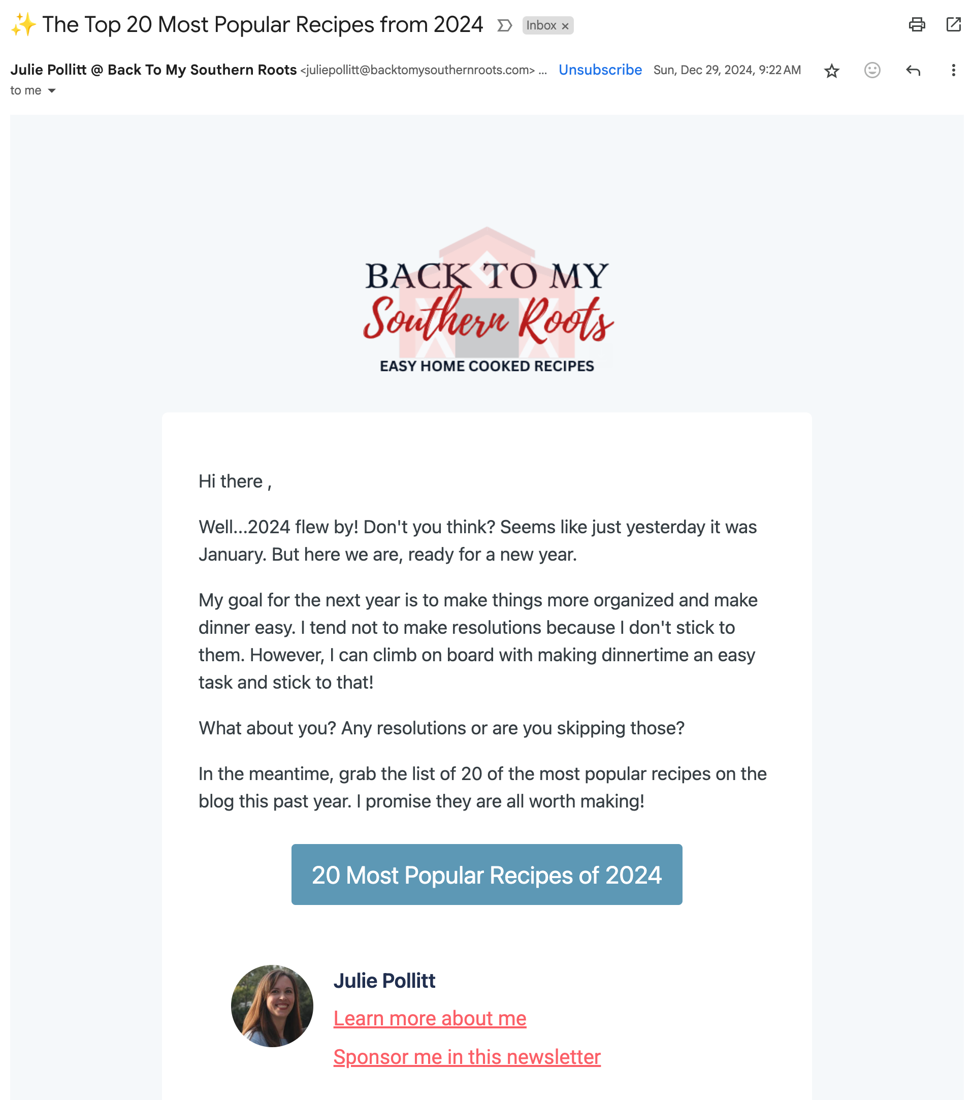 The options here are endless. And if you want to save people from having to scroll through a ton of recipes in your email, you can always send them to a blog post with all the info like Julie Pollitt of Back to my Southern Roots does here:
