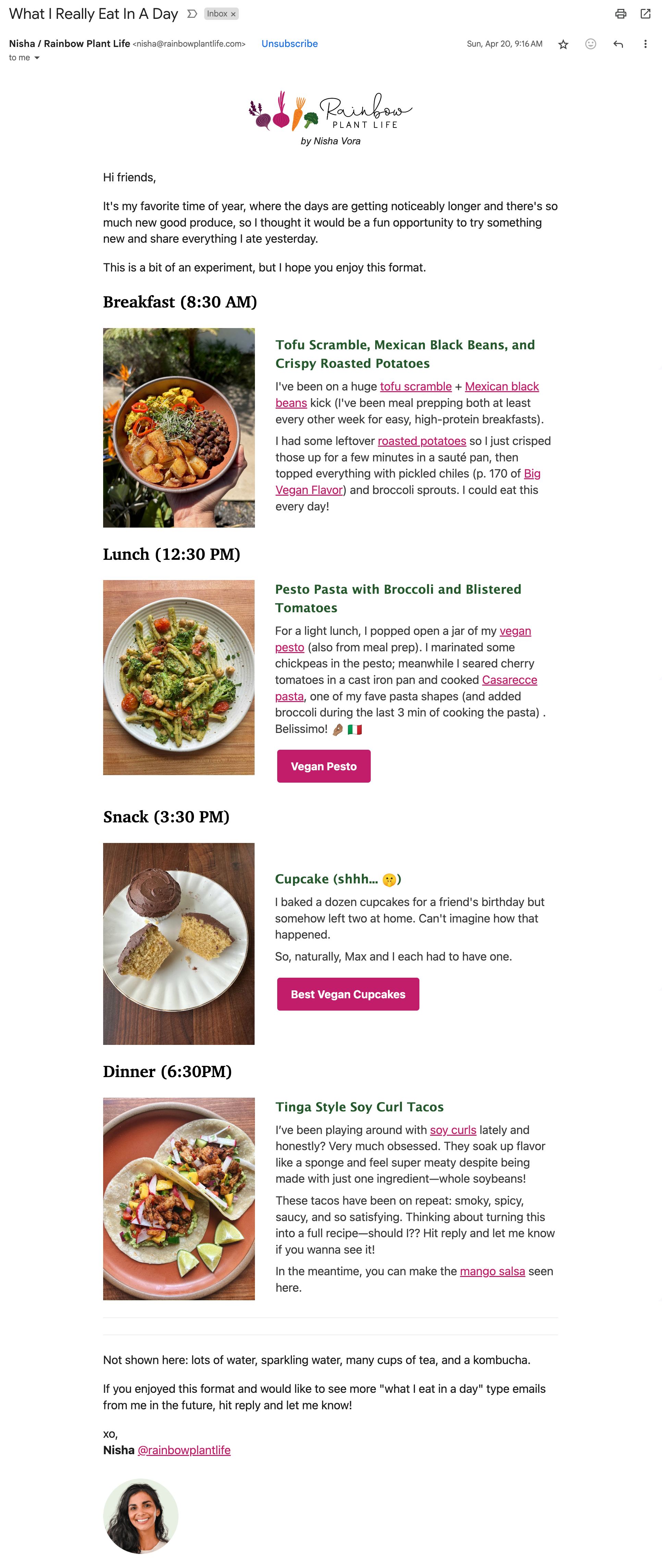 By sharing what she actually eats in a day, her audience gets to know her better. And it’s a really organic way to share your favorite recipes.
