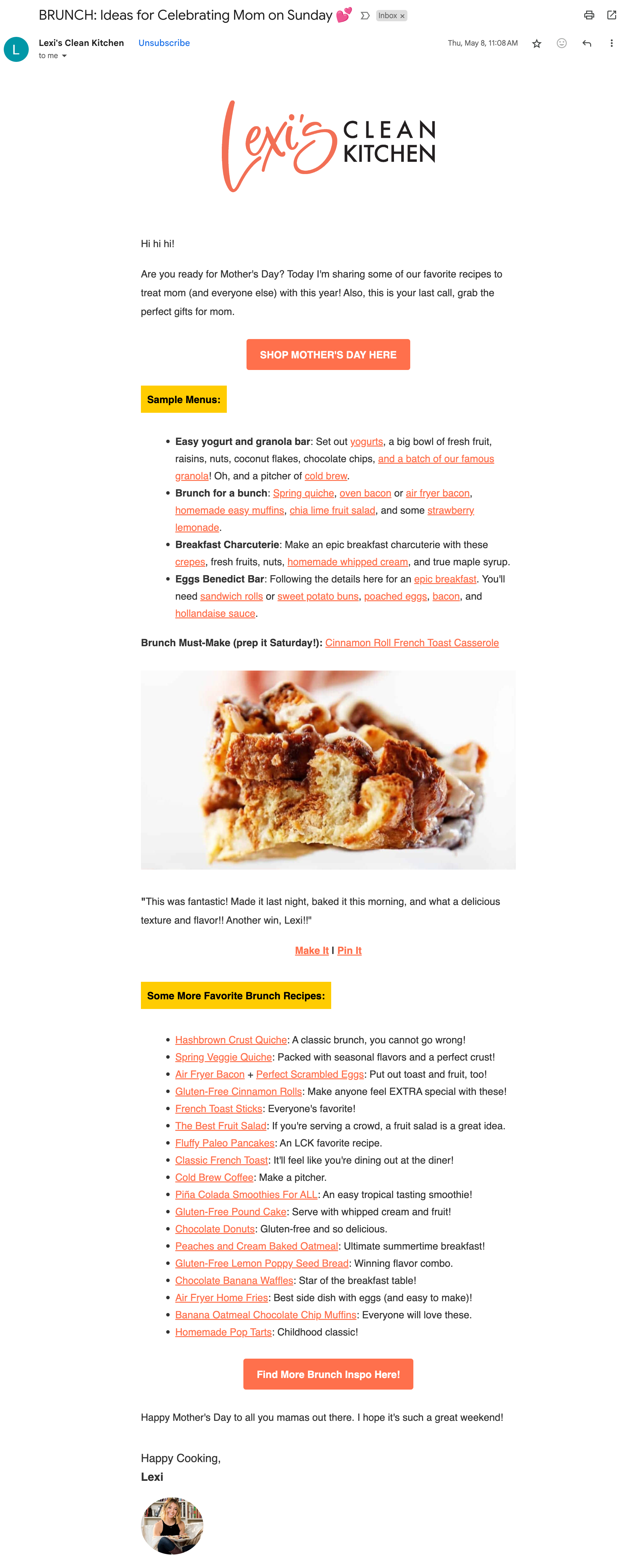Lexi Davidson (@lexiscleankitchen) Lexi’s Clean Kitchen put together an incredible sample Mother’s Day menu here: