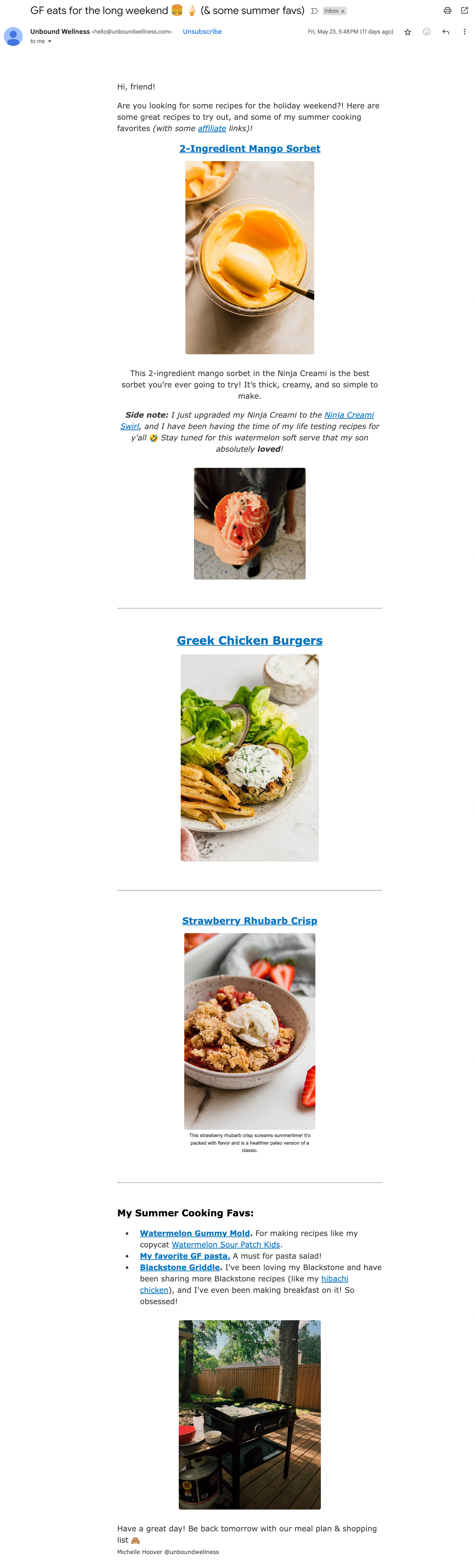 I love how Michelle incorporates her favorite summer cooking items as part of this Memorial Day email: